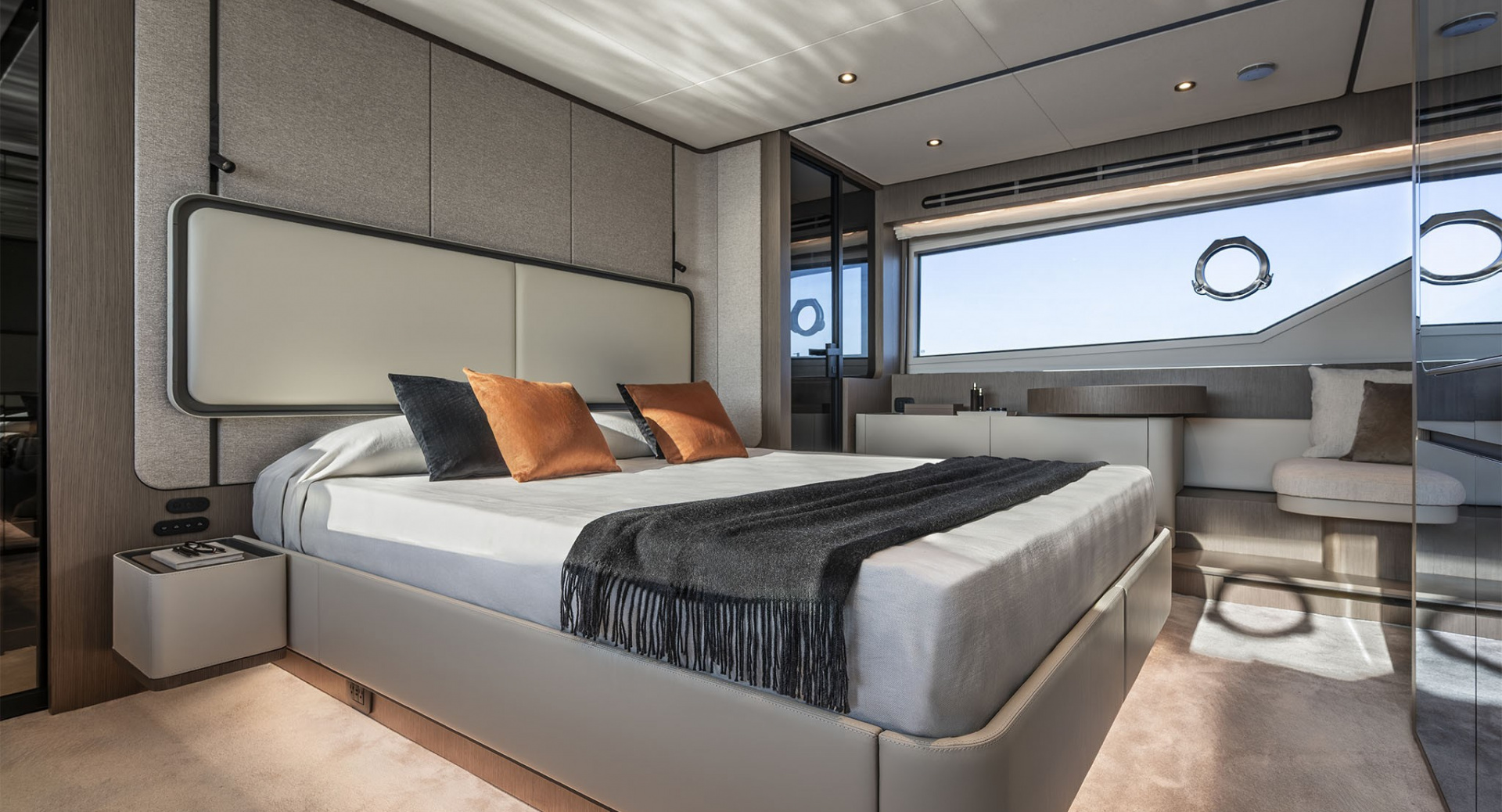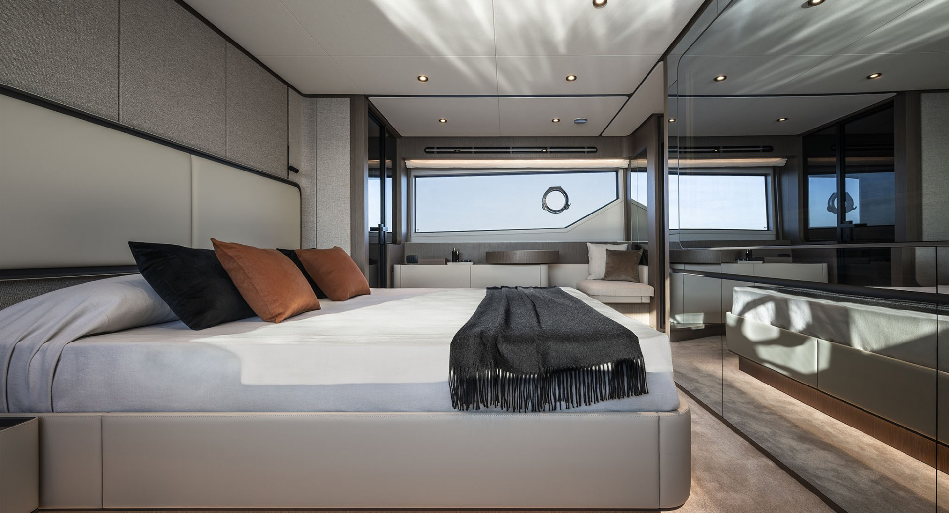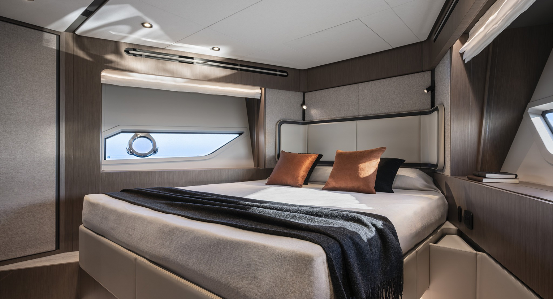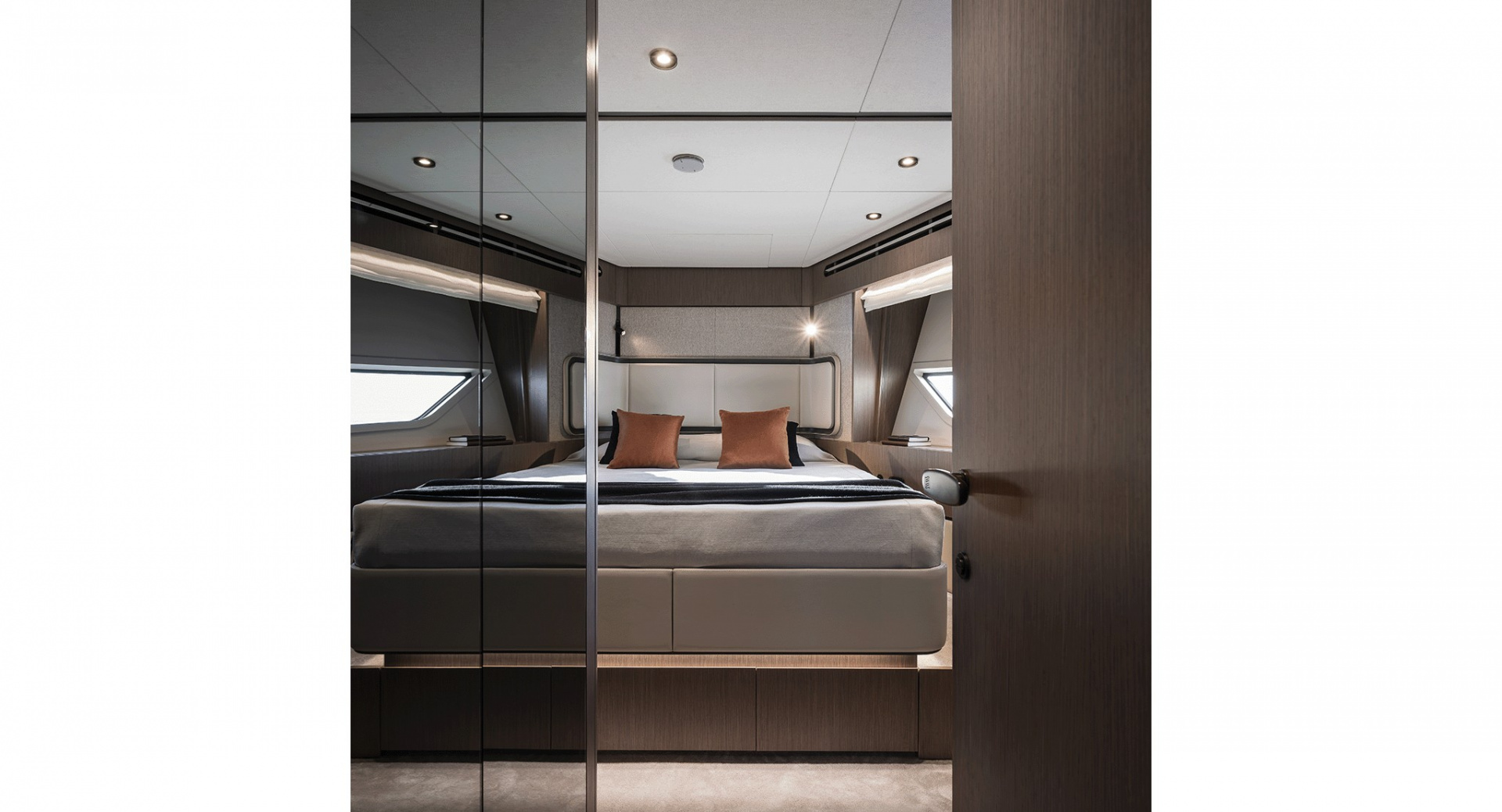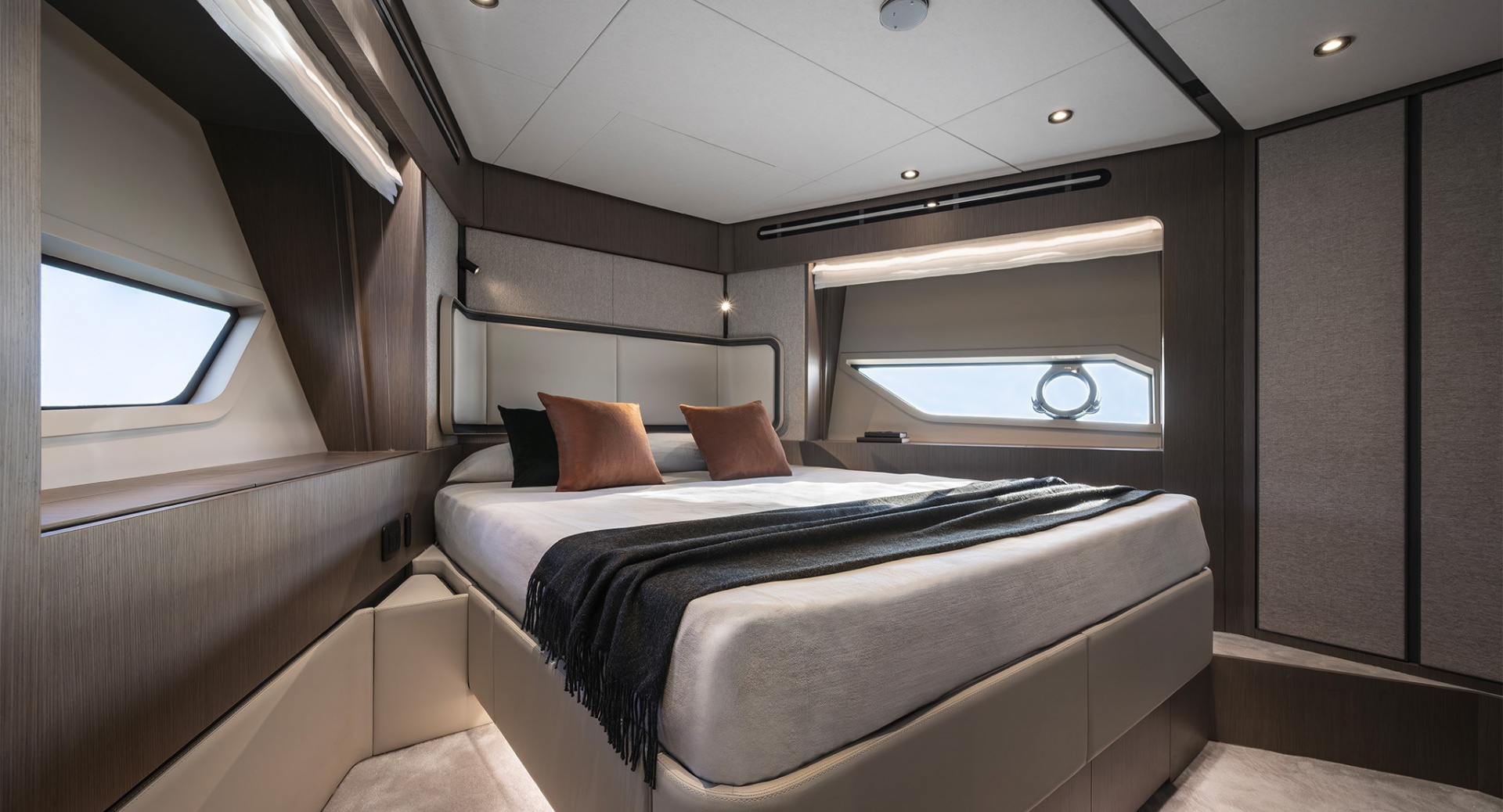 В мастер–каюте выделены отдельные помещения под гардероб и ванную комнату. Топливные баки расположены перед машинным отделением, создавая дополнительную шумоизоляцию для владельца.