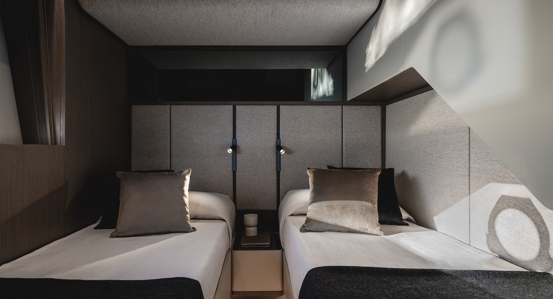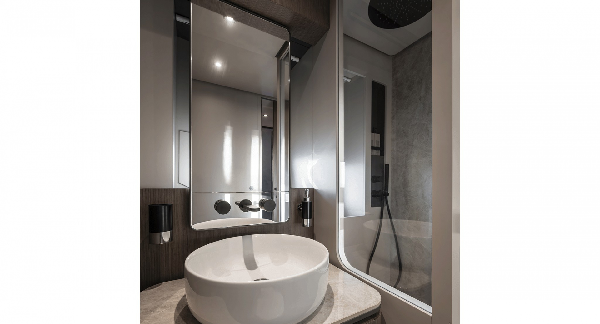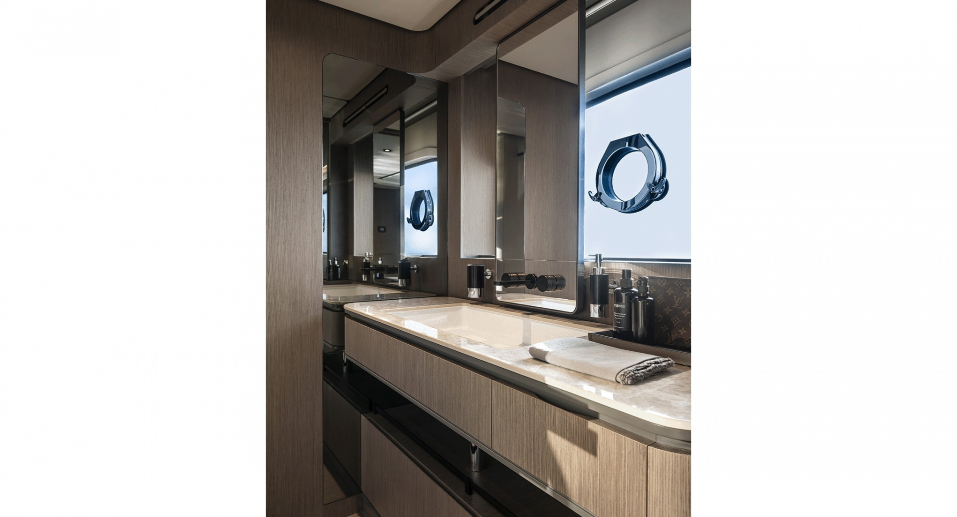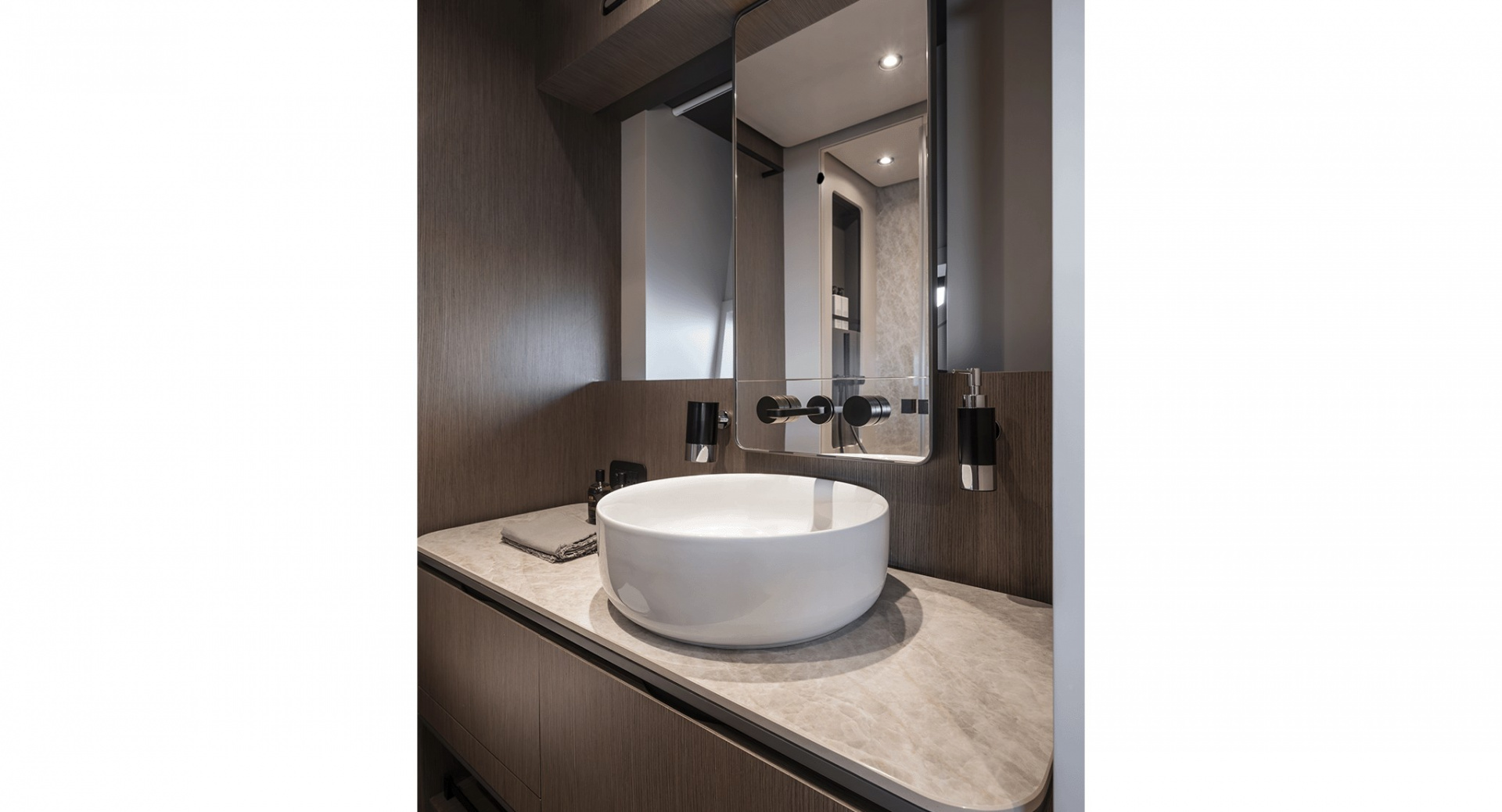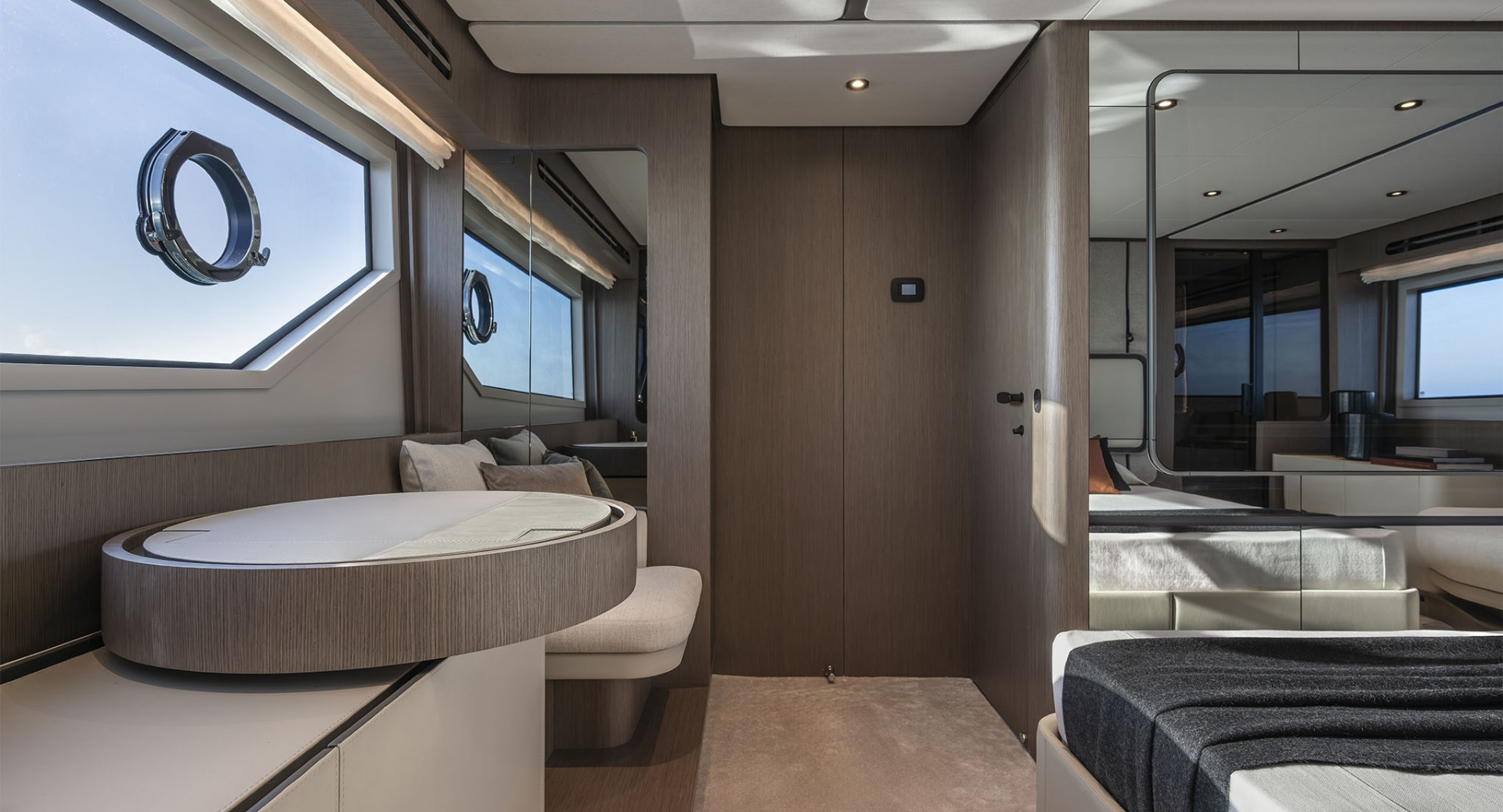 В мастер–каюте выделены отдельные помещения под гардероб и ванную комнату. Топливные баки расположены перед машинным отделением, создавая дополнительную шумоизоляцию для владельца.