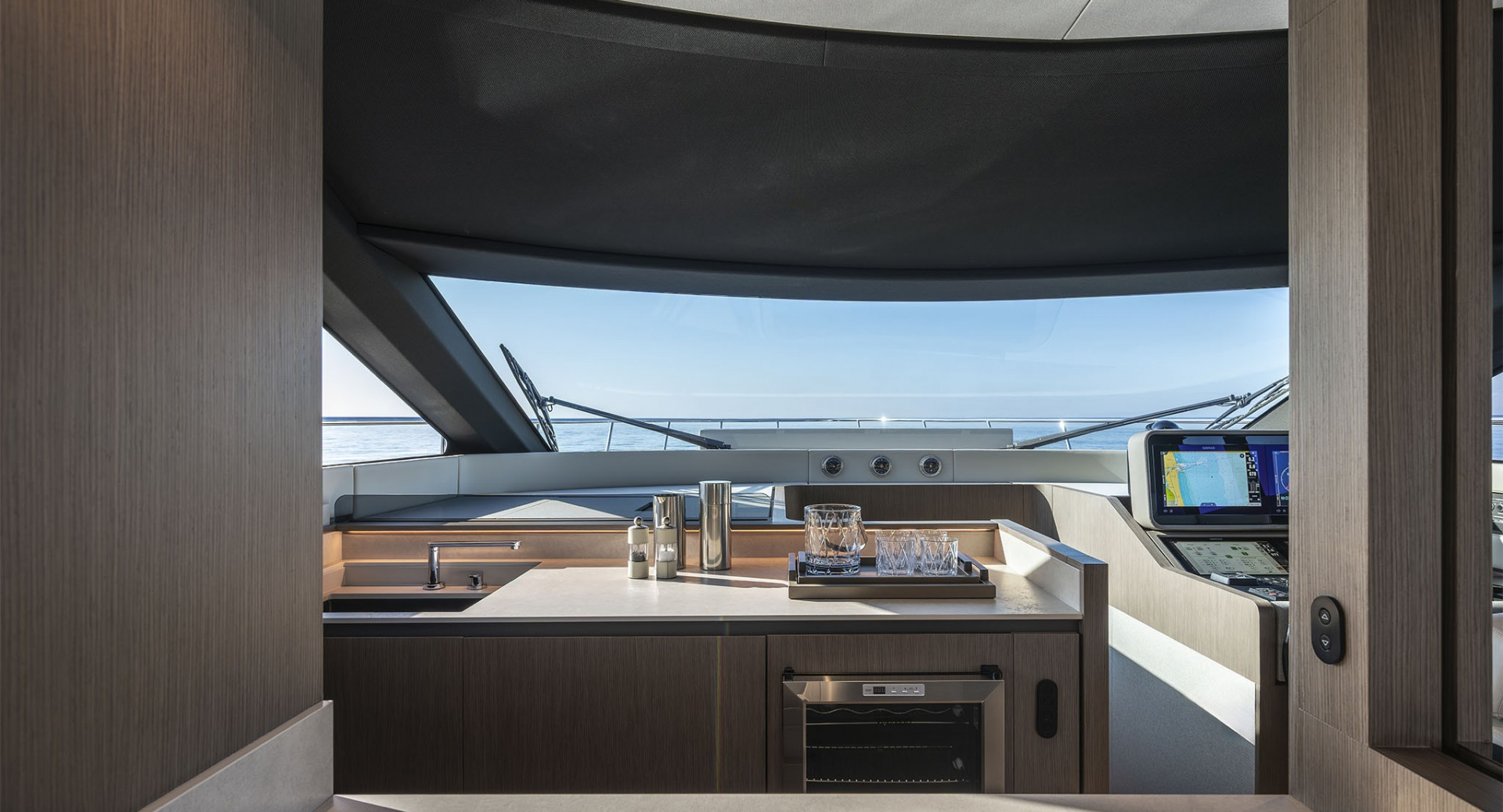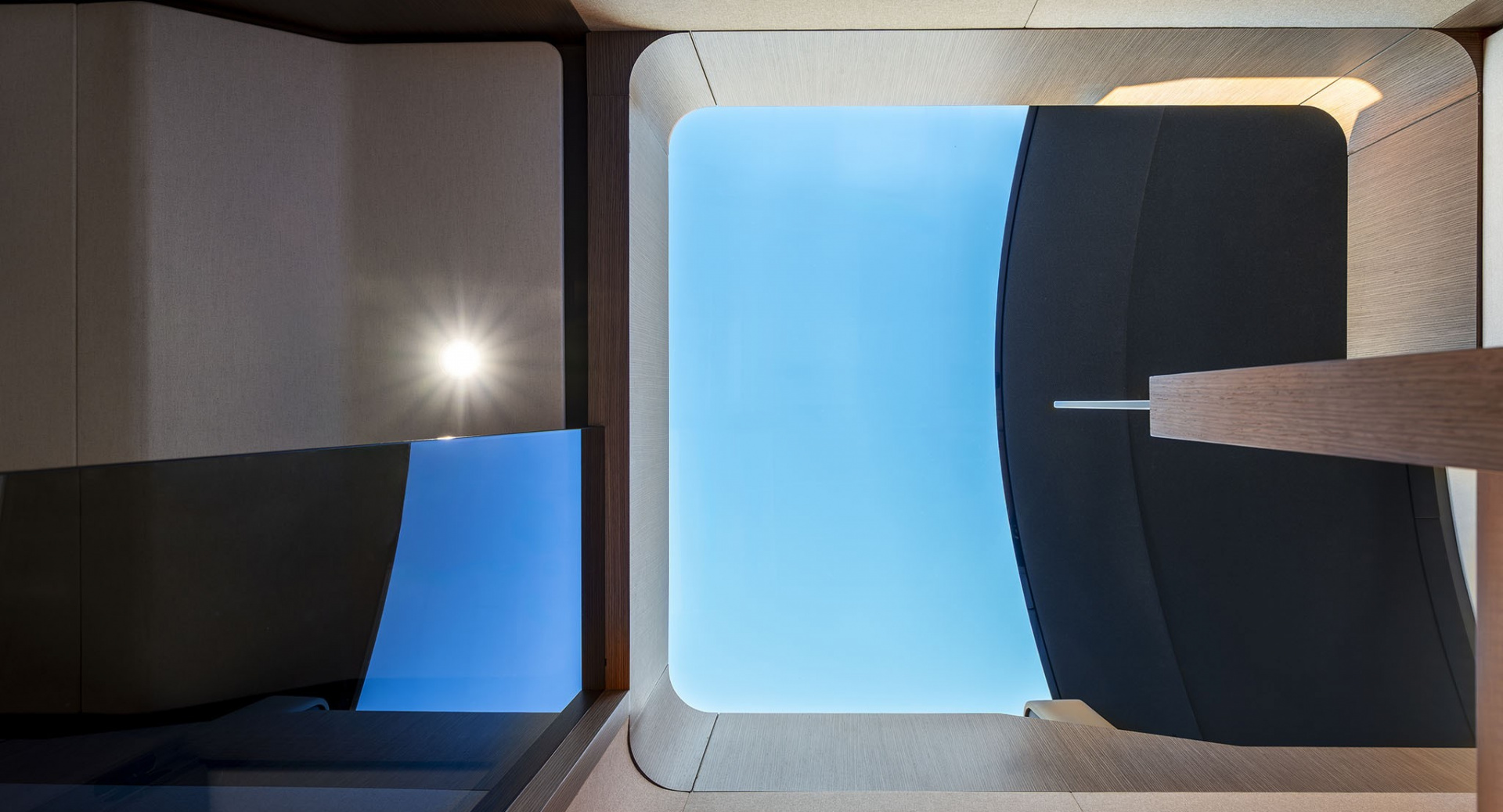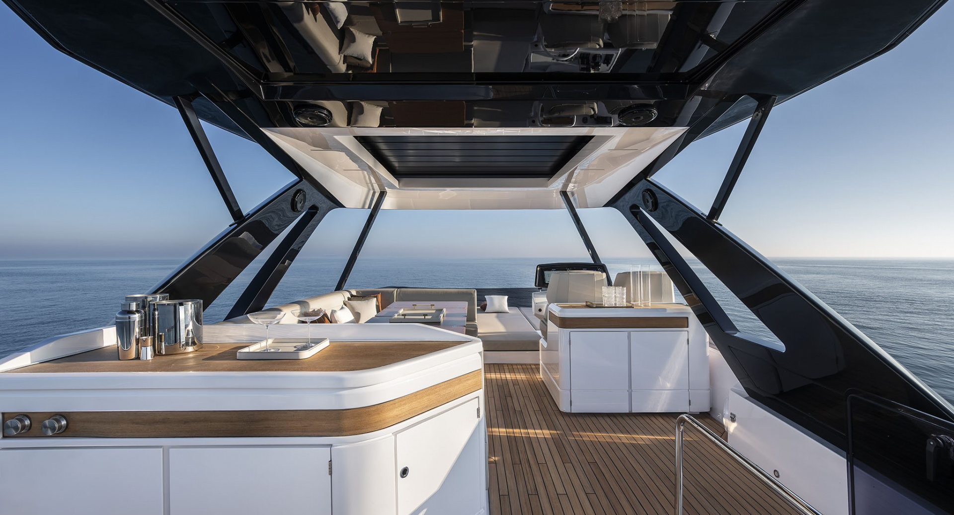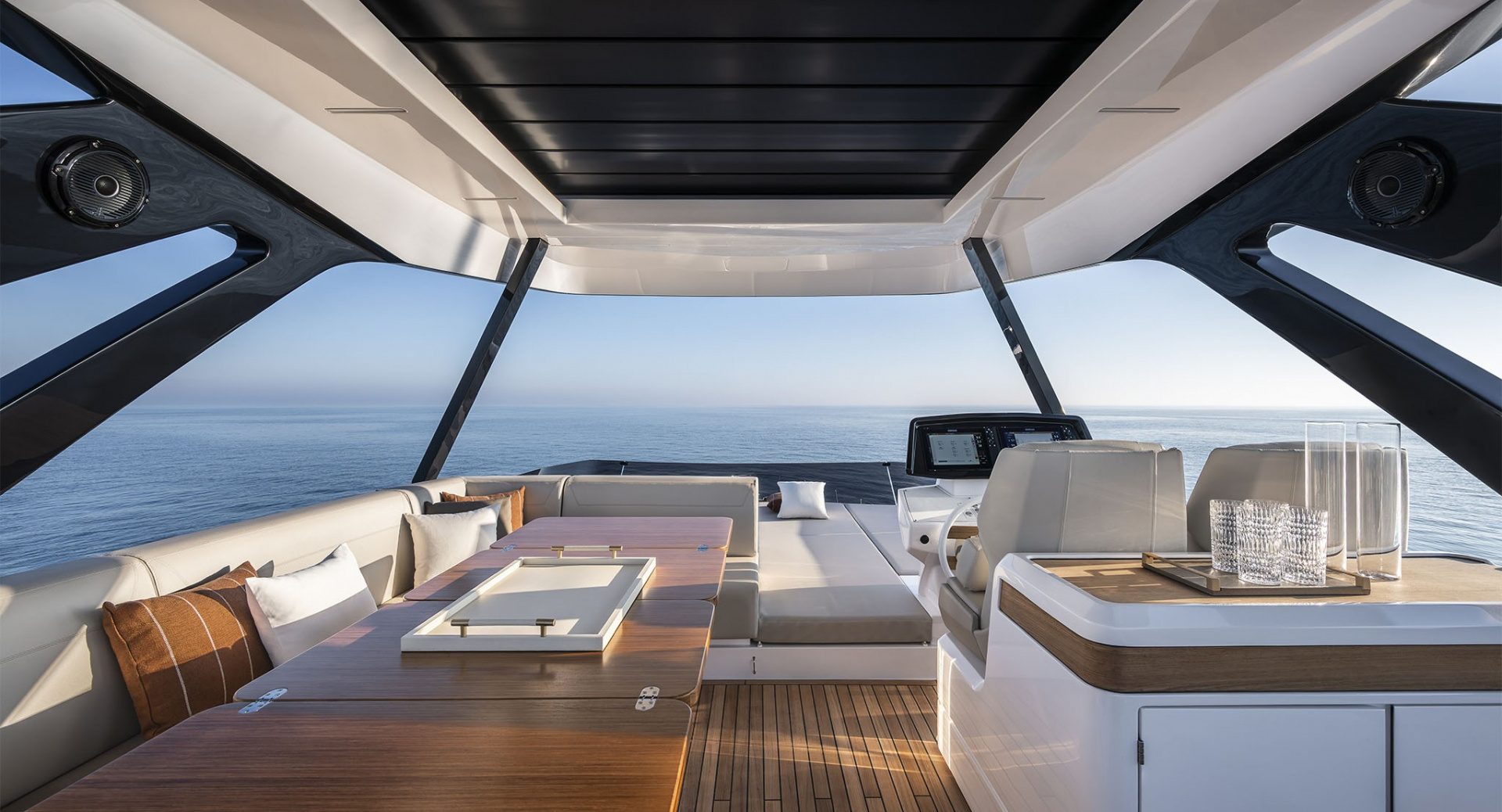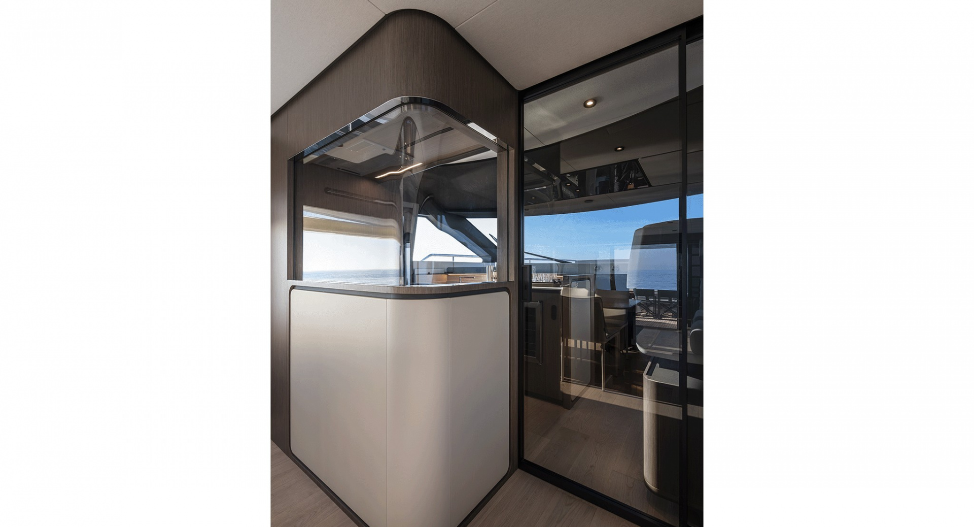 Главный салон отделен от кокпита уникальной, полностью «исчезающей» стеклянной перегородкой-трансформером с раздвигающимися дверями, благодаря чему внешние и внутренние зоны становятся единым пространством.