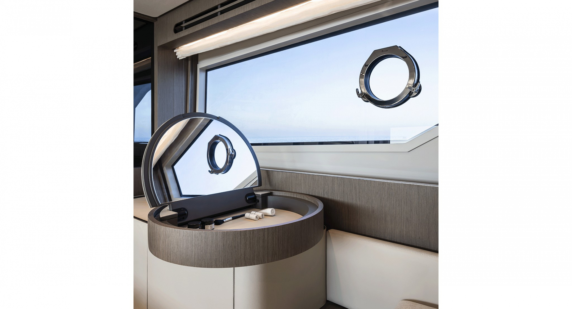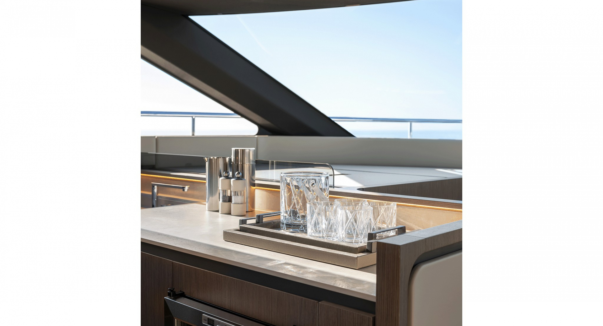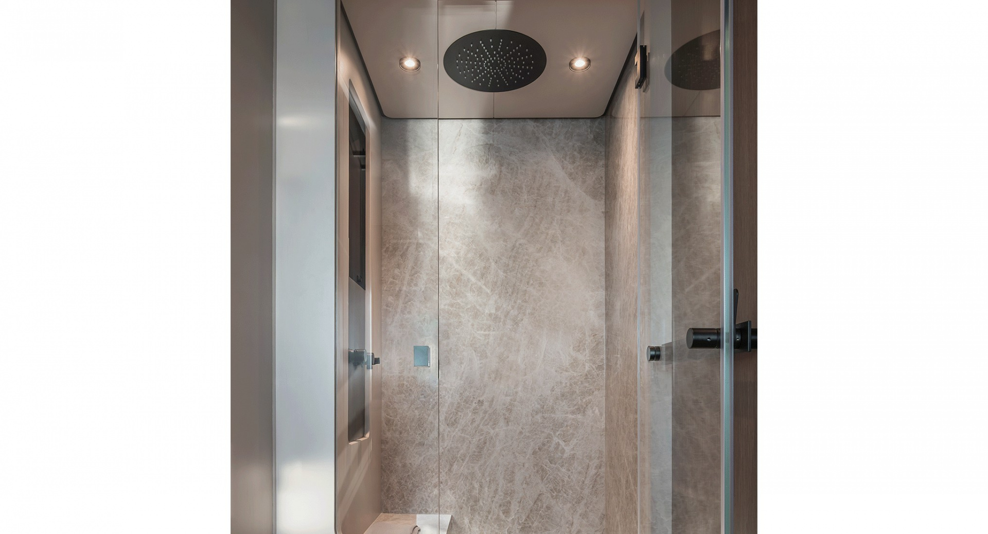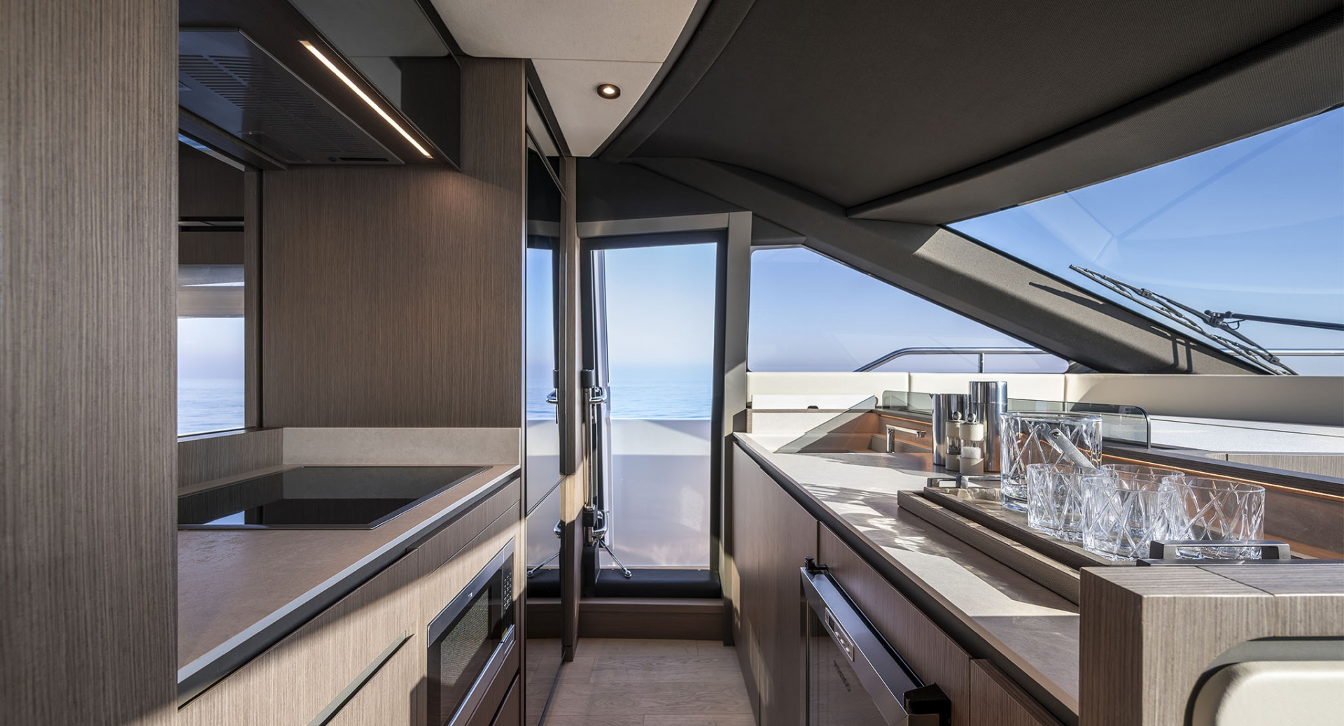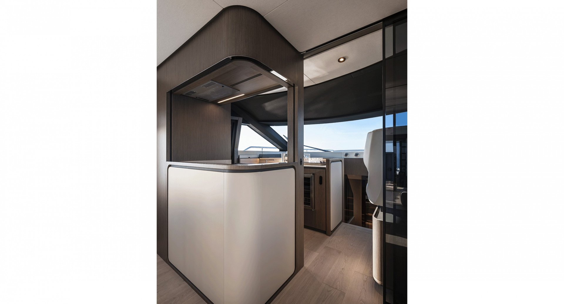 Главный салон отделен от кокпита уникальной, полностью «исчезающей» стеклянной перегородкой-трансформером с раздвигающимися дверями, благодаря чему внешние и внутренние зоны становятся единым пространством.