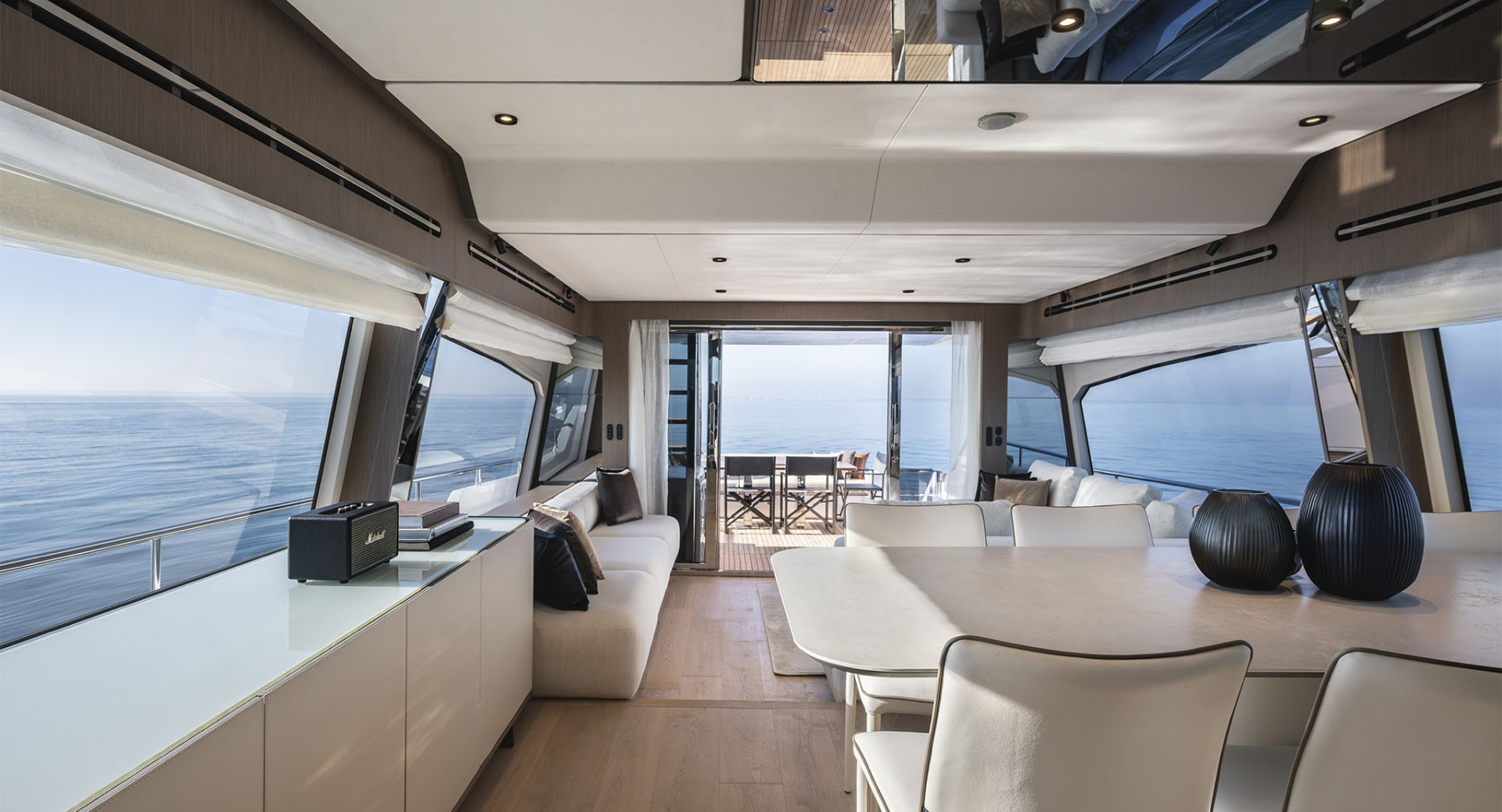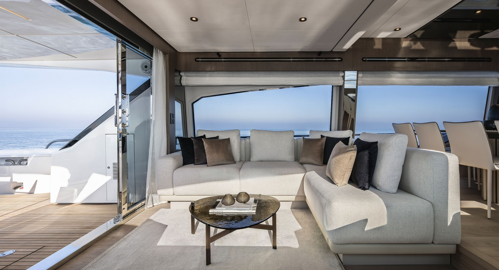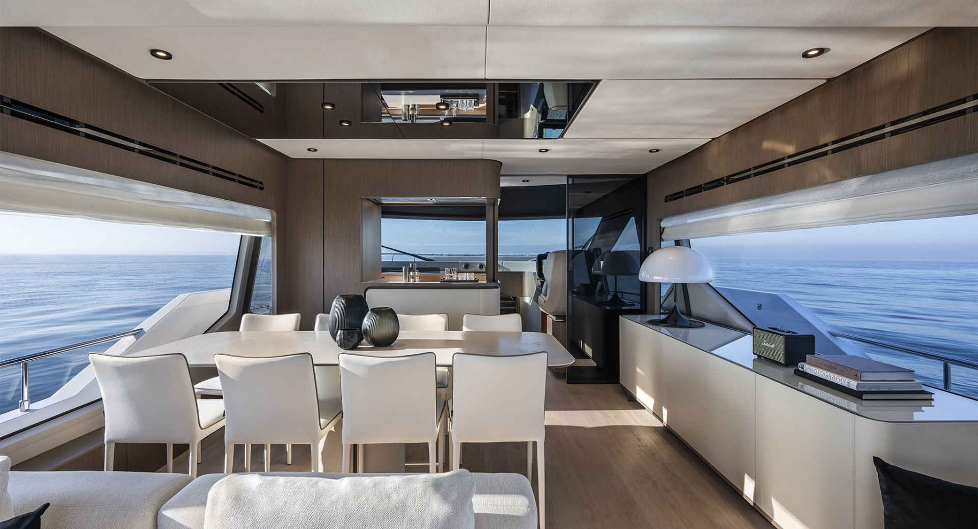 Удивительно функциональная и просторная обеденная зона-студия на 8 человек изящно спланированная в передней части главного салона - настоящая гордость архитекторов Ferretti Yachts.