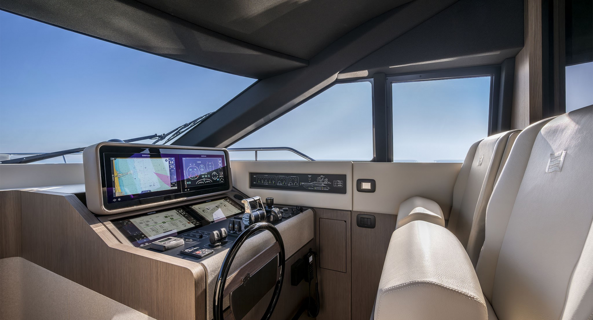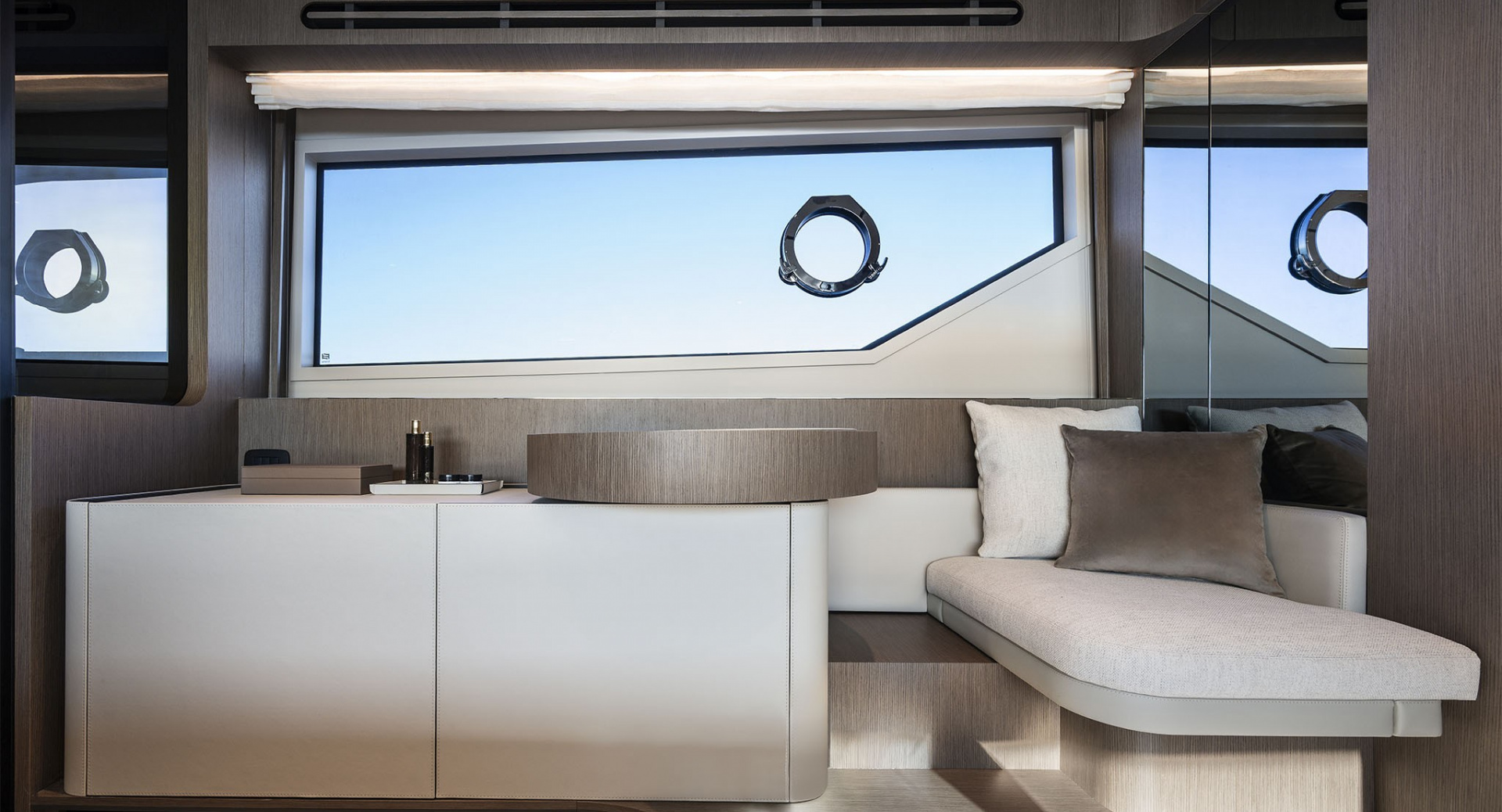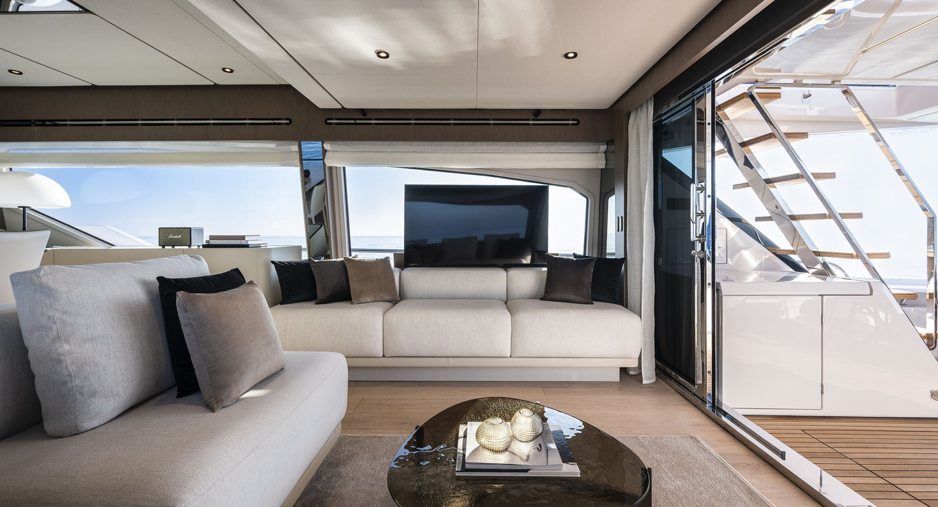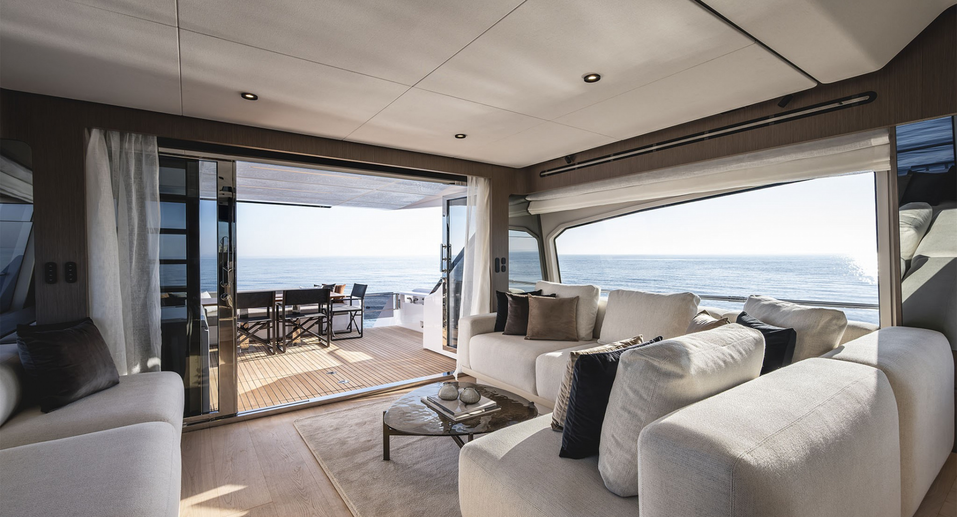 Удивительно функциональная и просторная обеденная зона-студия на 8 человек изящно спланированная в передней части главного салона - настоящая гордость архитекторов Ferretti Yachts.