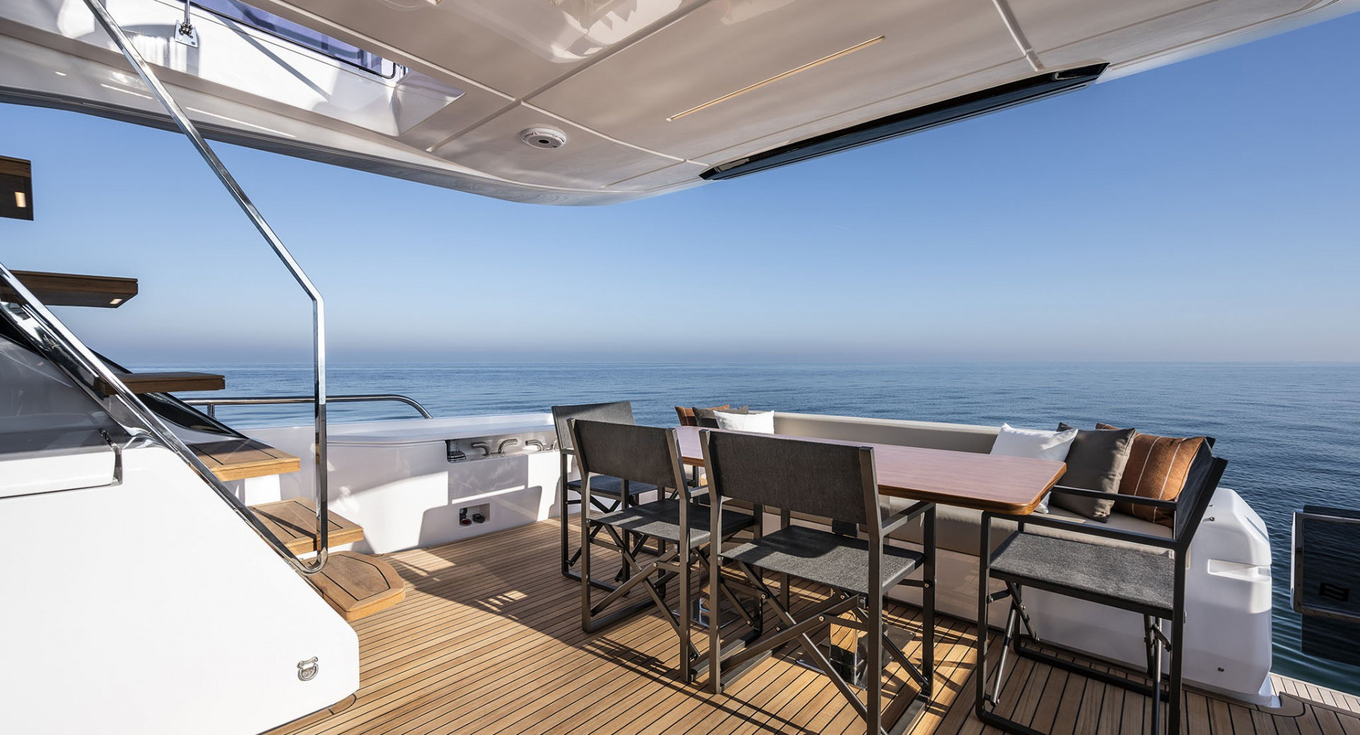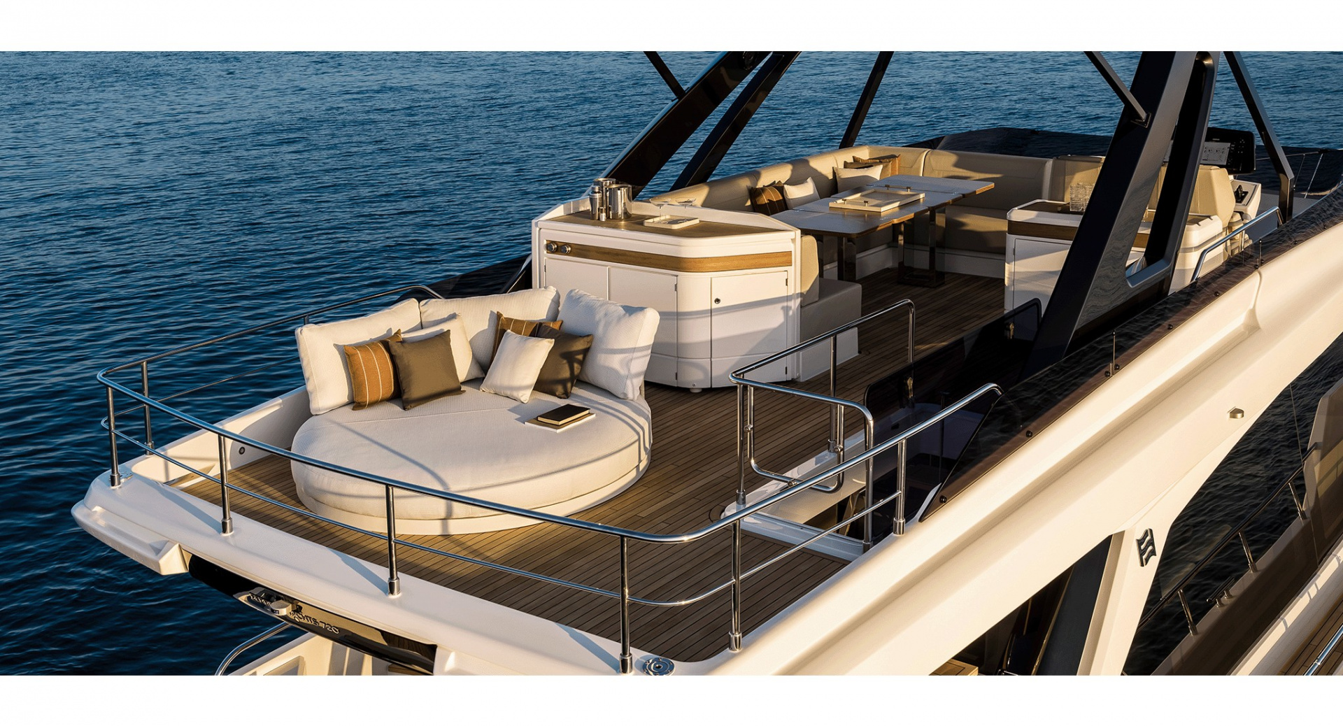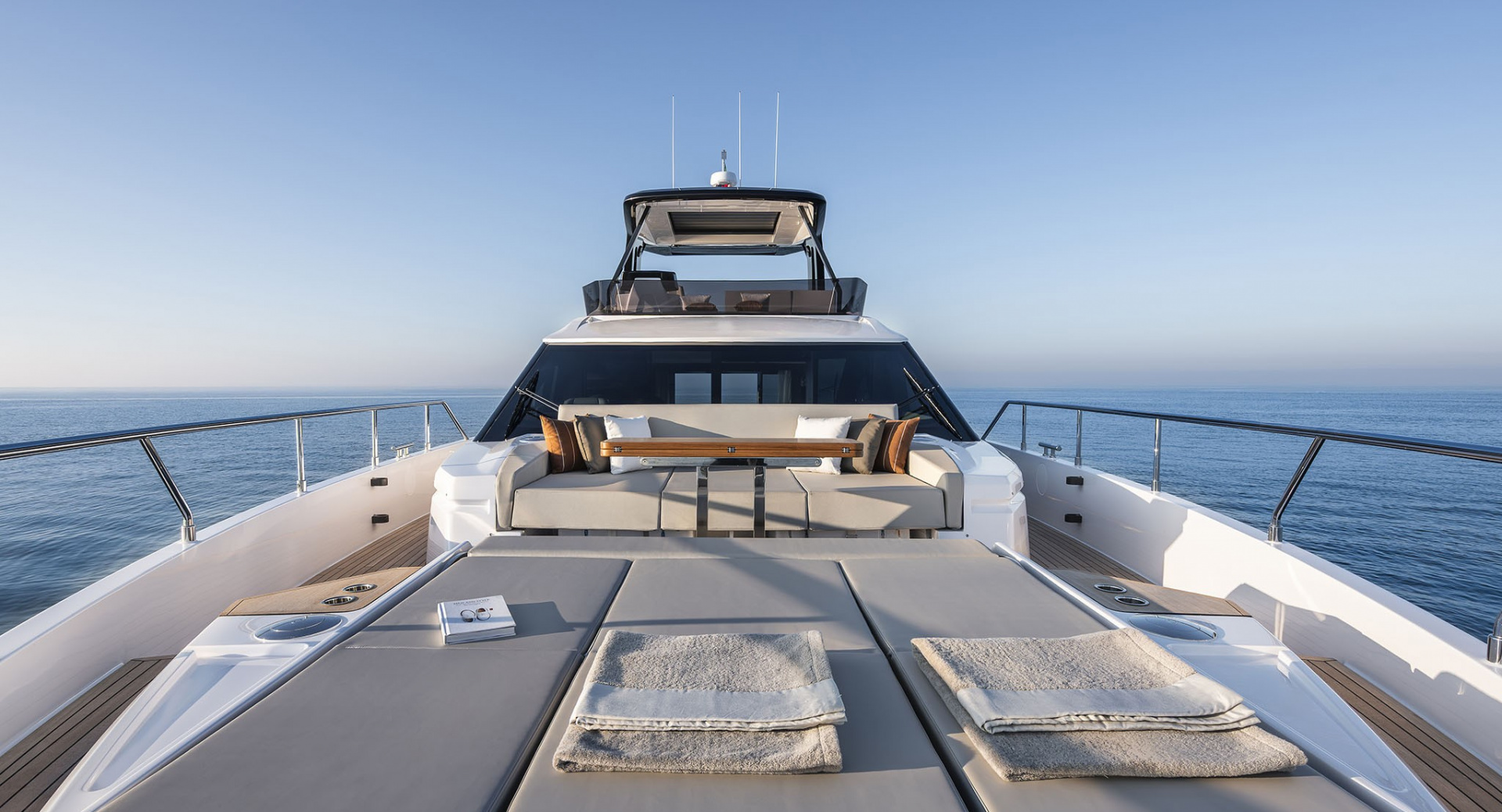Просторный флайбридж c хардтопом, грилем и обеденной зоной, позволил оставить место под свободностоящую мебель и организовать ложу для загара во всю ширину верхней палубы. Носовая часть яхты продумана до мелочей и может похвастаться обеденной зоной, а также лежаками для загара с мягкой влагостойкий обивкой.