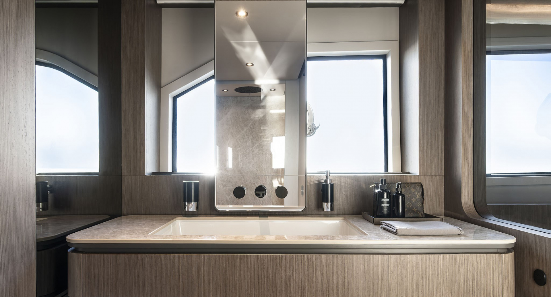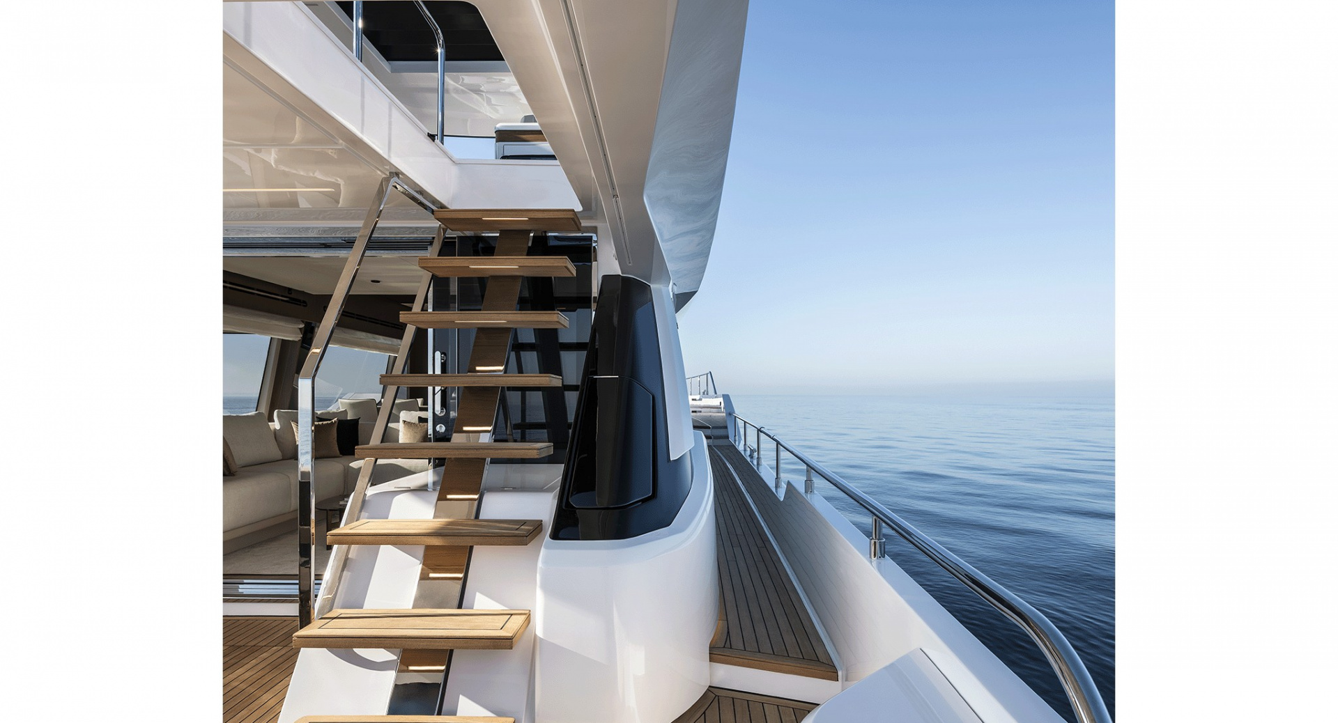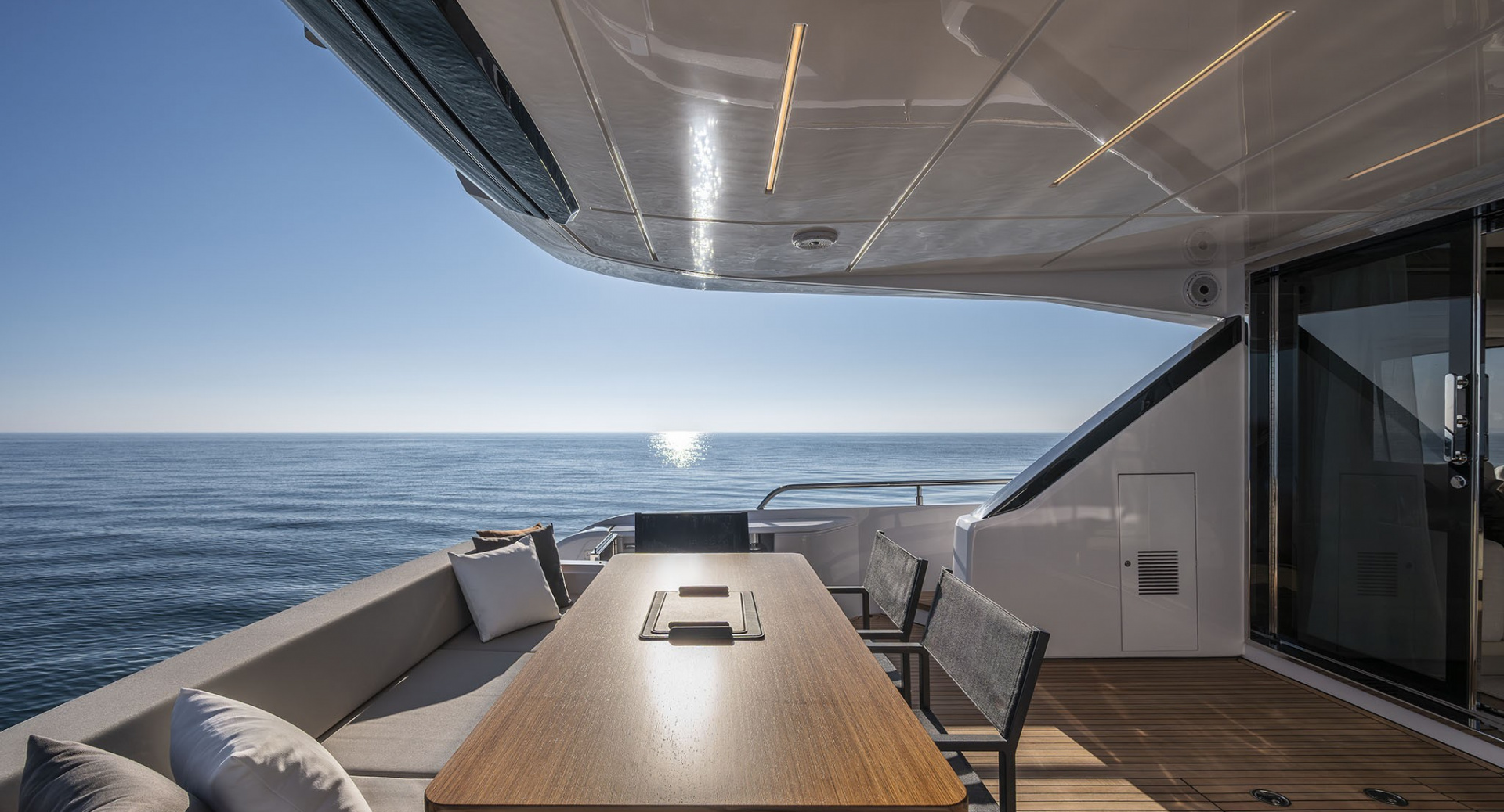 Просторный флайбридж c хардтопом, грилем и обеденной зоной, позволил оставить место под свободностоящую мебель и организовать ложу для загара во всю ширину верхней палубы. Носовая часть яхты продумана до мелочей и может похвастаться обеденной зоной, а также лежаками для загара с мягкой влагостойкий обивкой.